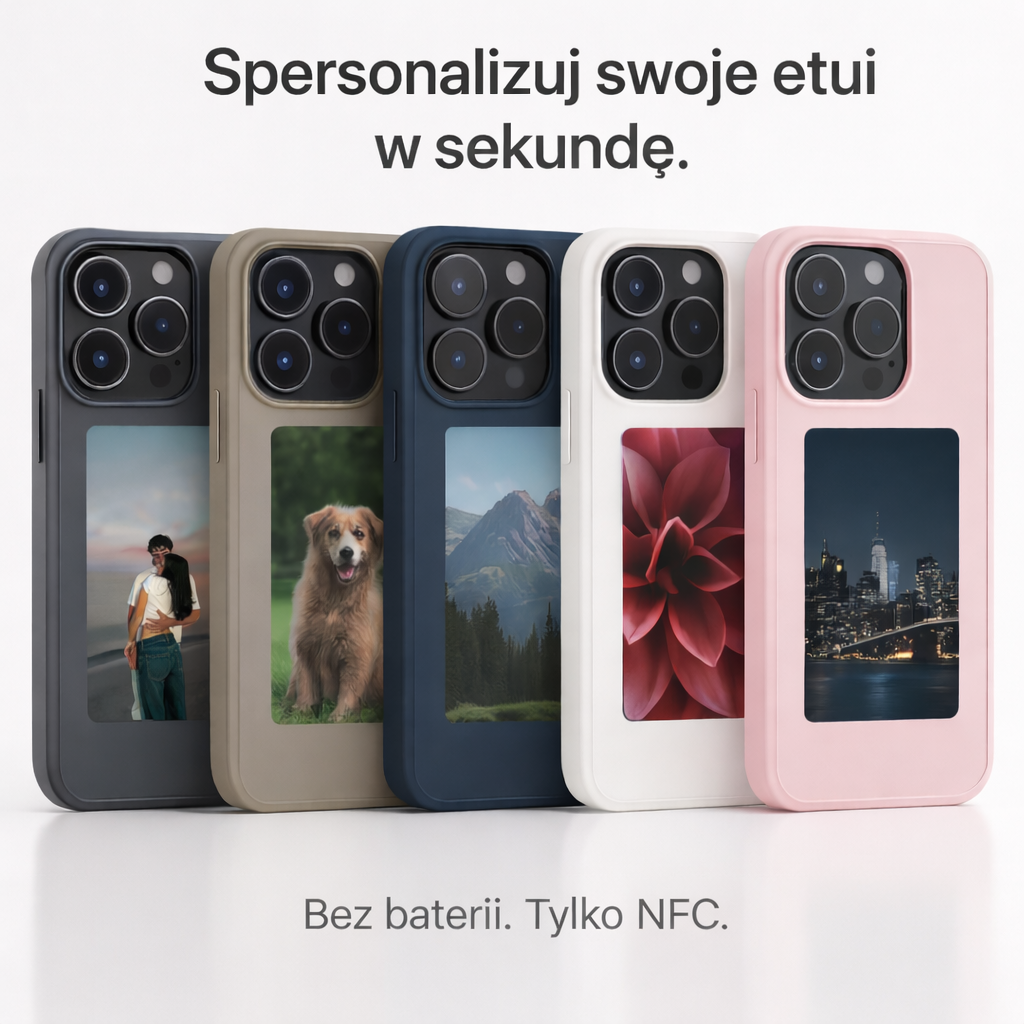 Ekran E-Ink zużywa energię tylko w momencie zmiany grafiki, dlatego etui nie wymaga baterii ani ładowania. Raz ustawiony wzór pozostaje widoczny przez cały czas.